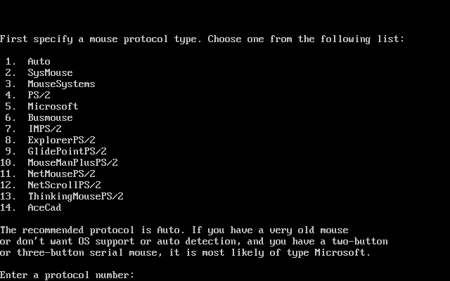 Select your mouse from the menu presented. If you don't see your serial mouse listed, pick the Microsoft protocol -- it's the most common and will probably work. Next xorgconfig will ask you about using ChordMiddle and Emulate3Buttons. You'll see these options described in detail on the screen. Use them if the middle button on your mouse doesn't work under X, or if your mouse only has two buttons (Emulate3Buttons lets you simulate the middle button by pressing both buttons simultaneously). Then, enter the name of your mouse device. The default choice, /dev/mouse, should work since the link was configured during Slackware setup. If you're running GPM (the Linux mouse server) in repeater mode, you can set your mouse type to /dev/gpmdata to have X get information about the mouse through gpm. In some cases (with busmice especially) this can work better, but most users shouldn't do this.