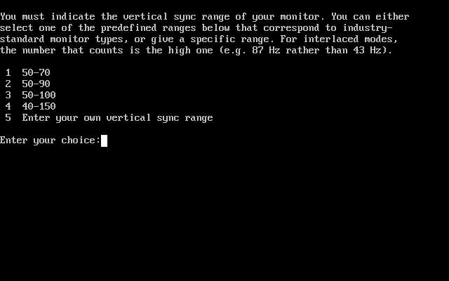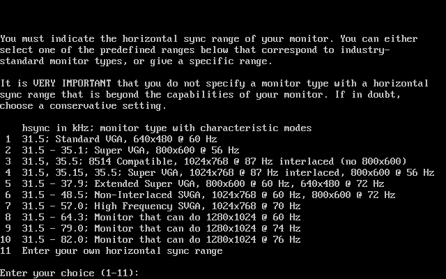 In the next section you enter the sync range for your monitor. To start configuring your monitor, press ENTER. You will see a list of monitor types -- choose one of them. Be careful not to exceed the specifications of your monitor. Doing so could damage your hardware.