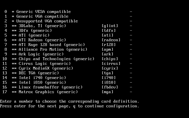 Now you have the opportunity to look at the database of video card types. You'll want to do this, so say “y”, and select a card from the list shown. If you don't see your exact card, try selecting one that uses the same chipset and it will probably work fine.